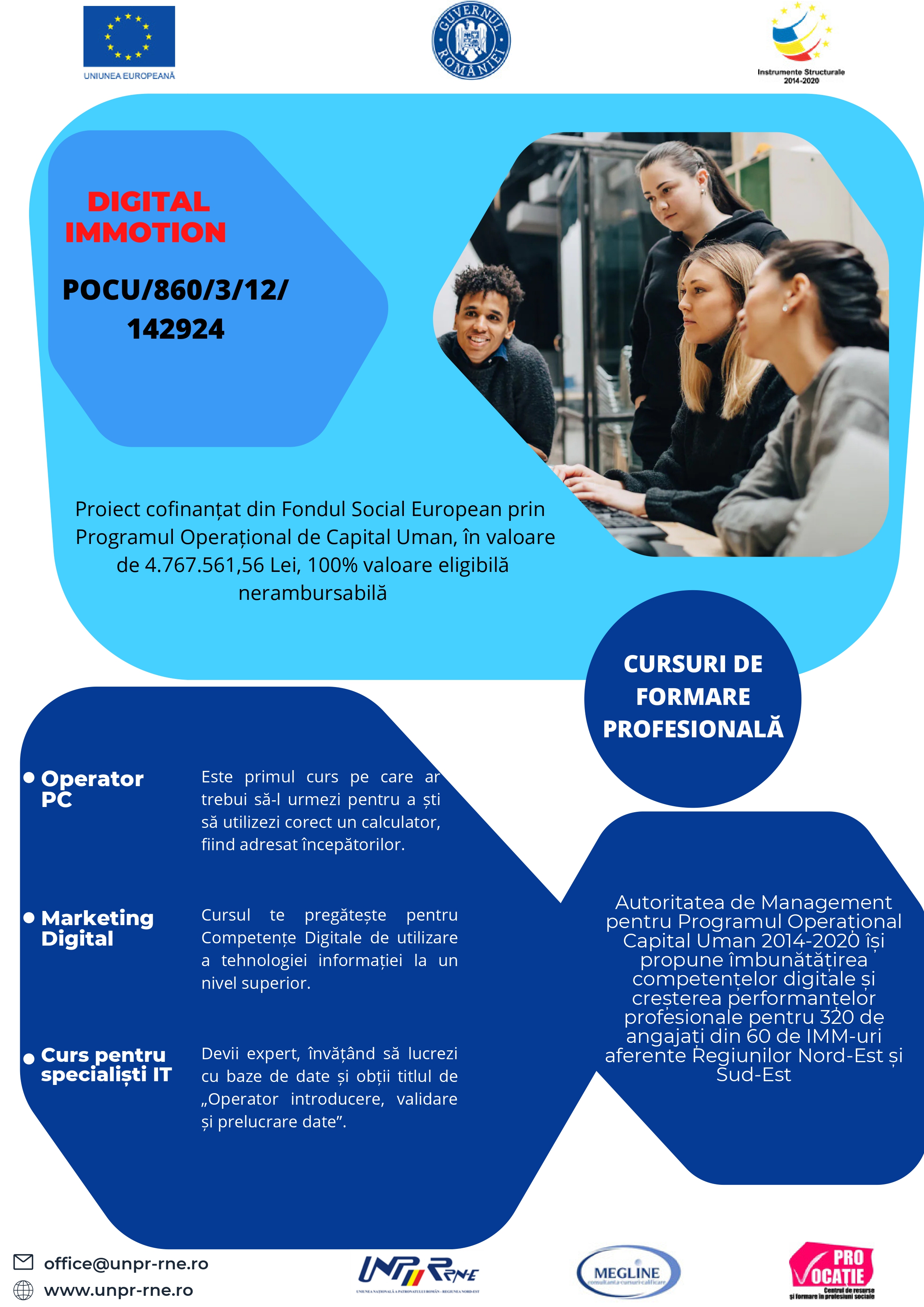 Poți fi una dintre IMM-urile ce beneficiază de programe de formare profesională gratuite pentru angajați prin activitățile desfășurate în cadrul proiectului POCU/860/3/12/142924-”Digital IMMotion”-IDMySMIS: 142924.